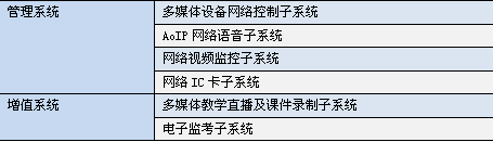 本方案的管理系統(tǒng)由多媒體設(shè)備網(wǎng)絡(luò)控制系統(tǒng)、AoIP網(wǎng)絡(luò)語音系統(tǒng)、網(wǎng)絡(luò)視頻監(jiān)控系統(tǒng)、網(wǎng)絡(luò)IC卡系統(tǒng)等子系統(tǒng)構(gòu)成。這些子系統(tǒng)均既可獨(dú)立運(yùn)行,并不相互依賴,又可相互協(xié)作配合實(shí)現(xiàn)綜合管理控制。比如網(wǎng)絡(luò)控制系統(tǒng)與網(wǎng)絡(luò)IC卡系統(tǒng)相互獨(dú)立,提供了多種電子講臺(tái)使用授權(quán)的方式,一個(gè)出故障另一個(gè)還能起作用。這種弱耦合系統(tǒng)設(shè)計(jì)極大增強(qiáng)了整個(gè)系統(tǒng)運(yùn)行的可靠性,方便用戶分期實(shí)施,同時(shí)也便于系統(tǒng)的維護(hù)。